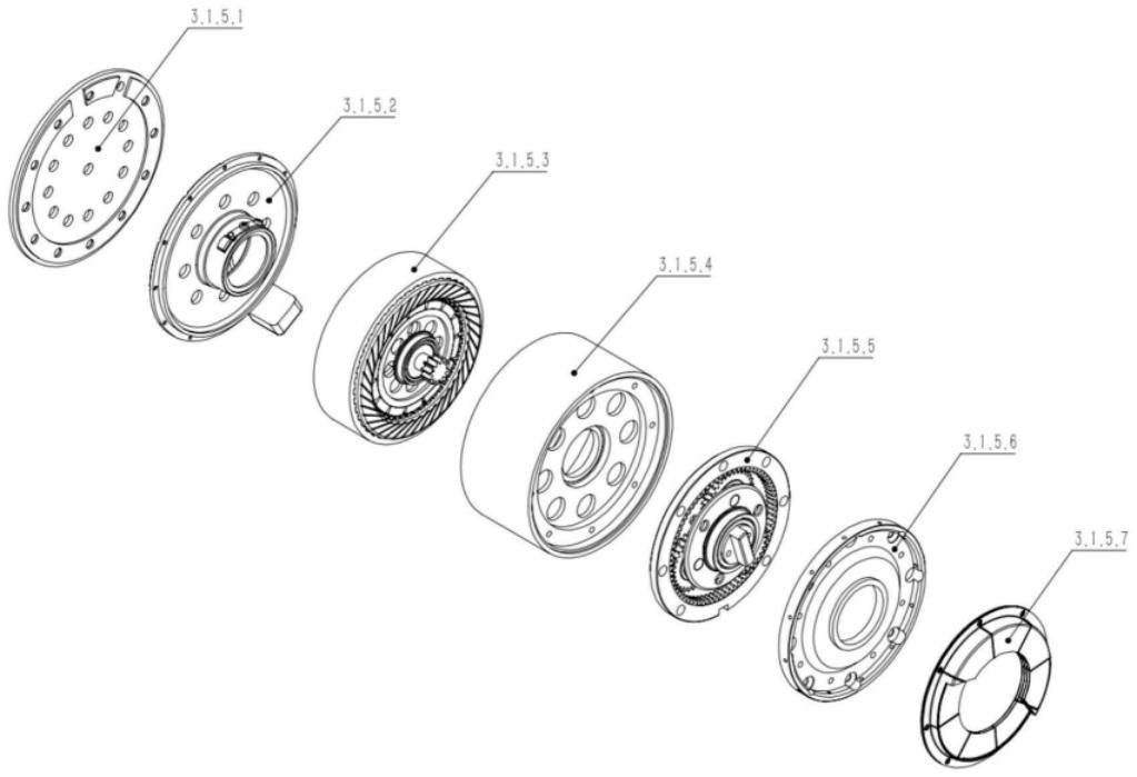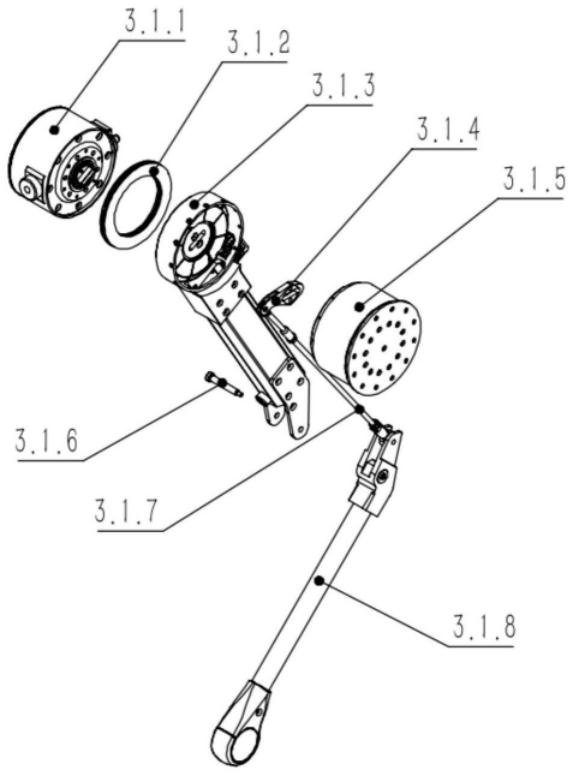 如图6所示,小腿电机总成3.1.5包括电机防摔防护板3.1.5.1、小腿电机后端盖总成3.1.5.2、小腿永磁无刷电机3.1.5.3、小腿电机外壳3.1.5.4、小腿电机行星轮减速器3.1.5.5、小腿电机正端盖3.1.5.6和散热片一3.1.5.7。