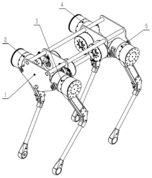 如图1所示,四足机器人机械结构,包括机身1和四个独立的腿模块,四个独立的腿模块包括:第一腿模块2、第二腿模块3、第三腿模块4、第四腿模块5。四个独立的 腿模块对称布置在机身的两侧,每一个腿模块与机身通过旋转副连接固定。