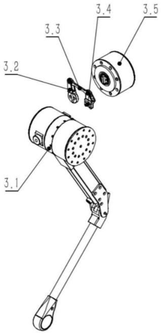 如图2和图3所示,腿模块结构,包括大小腿总成3.1和侧摆髋关节电机总成3.5。侧摆髋关节主动曲柄3.2、侧摆髋关节连杆3.3、侧摆髋关节从动曲柄3.4与机身1共同构成了平行四边形连杆传动机构。侧摆髋关节从动曲柄3.4与大腿电机总成3.5固定连接,侧摆髋关节电机总成3.5固定在机身上,侧摆髋关节主动曲柄3.2固定到侧摆髋关节电机总成3.5的侧摆髋关节行星轮减速器3.5.4输出轴上,侧摆髋关节行星轮减速器3.5.4输 出轴带动侧摆髋关节主动曲柄3.2做旋转运动,并通过平行四边形机构将该运动传递给大小腿总成3.1。平行四边形机构传递扭矩大,传动间隙小,结构简单且稳定可靠。