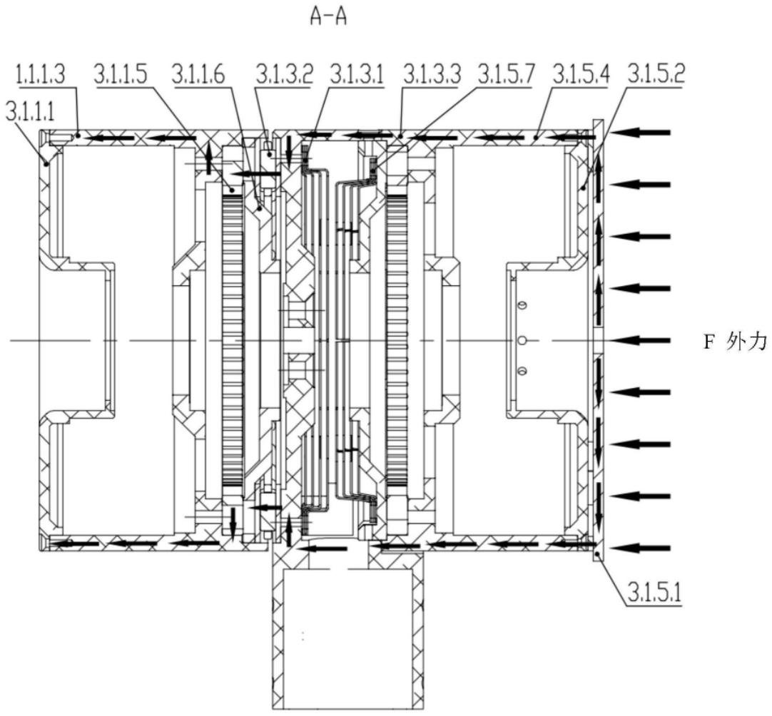 如图4和图5所示,大腿杆总成3.1.3与大腿电机行星轮减速器3.1.1.5输出轴固定连接,大腿电机行星轮减速器3.1.1.5输出轴带动大腿杆总成3.1.3做旋转运动,当四足机器人摔倒时,地面或障碍物对机器人腿部的冲击力通过电机防摔防护板3.1.5.1、小腿电机后端盖总成3.1.5.2、小腿电机外壳3.1.5.4、大腿基座3.1.3.3、推力轴承3.1.2、大腿电机外壳3.1.1.3、侧摆髋关节旋转销轴一3.1.1.4和侧摆髋关节旋转销轴二3.1.1.8传递到机身上,所述外部冲击直接通过上述强度较好的零部件传递,避免了大小腿电机总成内部转子、减 速器、轴承等脆弱结构受到冲击,提高了机器人腿部的抗冲击能力与可靠性。