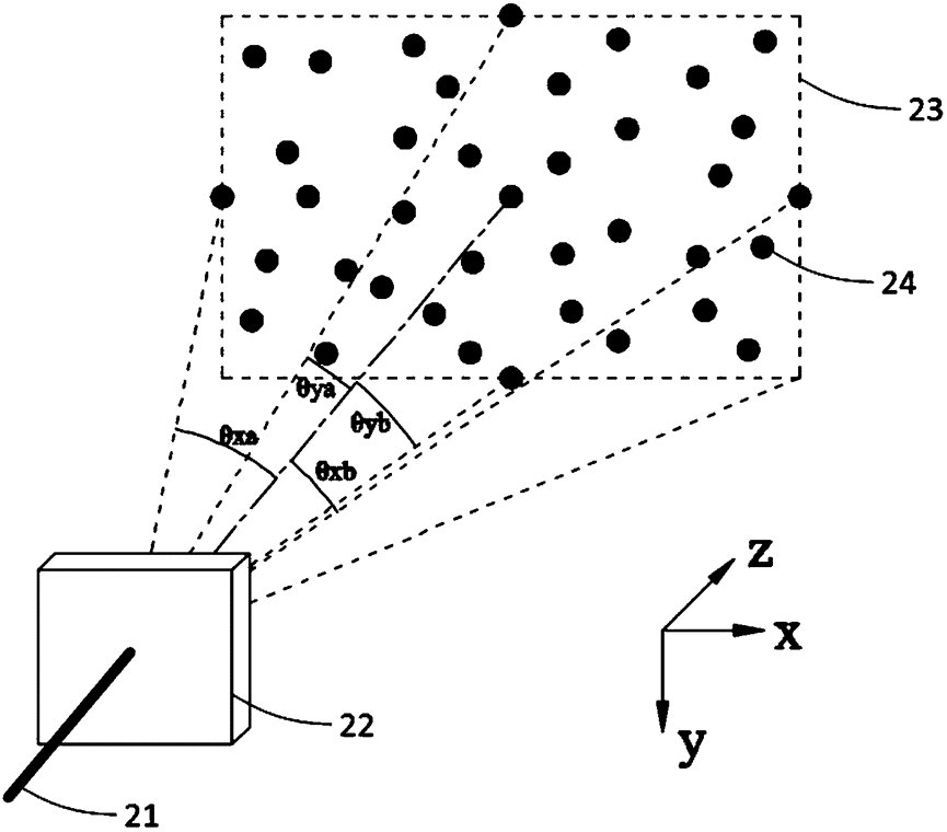 像图案的方形形状以及最终所形成的斑点图案的整体形状大体上是分别与x、y轴对齐(即方形的两条边分别与x、y轴平行),且结构光投影模组与采集模组的基线为x方向。在一些实施例中,为了进一步提高不相关度,可以将斑点图案的形状进行旋转,使得基线与斑点图案和/或像图案的任一边均不平行,即,使得斑点图案和/或像图案的原本与基线方向平行的边与基线之间产生了一定的夹角,由此可以进一步提升斑点图案沿基线方向上的不相关度,以提高深度计算精度。经验证,为了保证斑点图案要填充满整个采集模组的视场区域,夹角不宜过大,优选地,夹角为2至10度。可以理解的是,由于随机性,这里所说的斑点图案的边并非直边,可以将其理解成斑点图案中像图案排列的大致方向。