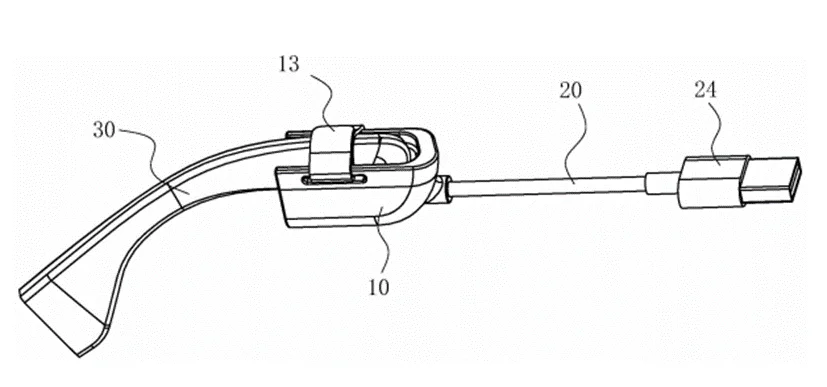 通过充电线缆连接眼镜镜腿对智能眼镜进行充电是目前最常见的充电方式,这种充电方式的优势在,充电线缆的技术成熟而且生产成本低。作为一项成熟技术,我们意外的发现有企业在2022年将其申请了实用新型专利且已经公开。