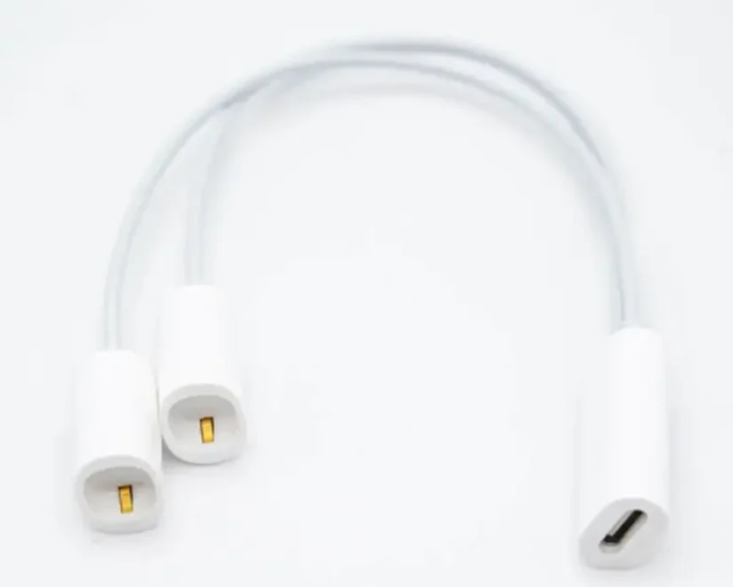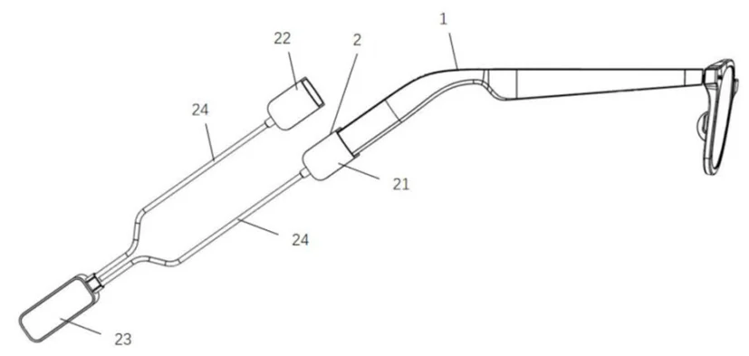 除了使用单条充电线缆(图1)给智能眼镜充电外,我们也看到了不少智能眼镜开始采用双线缆技术(图2),相关的专利文献也已公开。