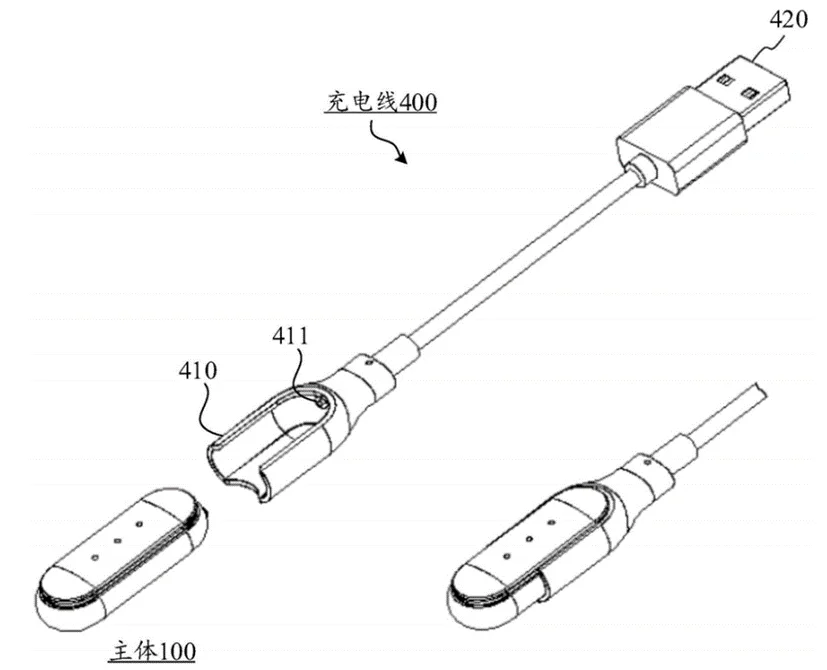 对比专利1公开了于一种可穿戴式设备及其制造方法,可穿戴设备包括主体和用于为主体充电的充电线(图)。充电线包括主体收容端和充电端;主体收容端形成有一用于容纳可穿戴式设备的主体的半空腔,半空腔的内表面上形成有两个充电端子,两个充电端子用于在可穿戴式设备的主体插接入所述半空腔时,与主体的两个充电触点电性接触相连;主体收容端的两个充电端子与充电端电性相连;充电端为通用串行总线USB接口、迷你通用串行总线MiniUSB接口、微型通用串行总线MicroUSB接口、30脚位pin接口和电源适配器中的至少一种。