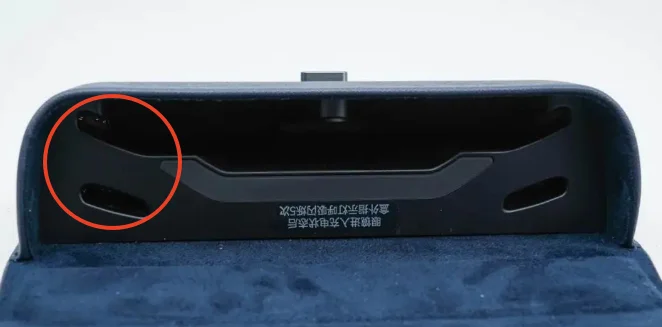 智能眼镜各具特色的充电方式,为用户带来不同的使用体验。相较于目前使用范围最广泛的充电线缆式充电,通过眼镜收纳盒的内置电池随时对智能眼镜进行充电是相对便捷和自由的方式。目前市售产品中销量最高的雷朋Meta Wayfarer智能眼镜就是采用的这一方式,作为智能眼镜的第一款爆款产品,雷朋Meta Wayfarer智能眼镜对充电方式的选择以及市场的反馈,代表着终端用户的心声。除雷朋Meta Wayfarer智能眼镜外,各品牌也在探索自己的通过眼镜收纳盒的内置电池进行充电的功能。雷鸟RayNeoV3智能眼镜通过在眼镜收纳盒内部提供两组充电触点(图3),从而实现按照任意顺序折叠左右镜腿都能通过眼镜收纳盒的内置电池为智能眼镜进行正常充电的功能。
