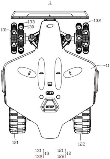 以上技术方案中所述全向轮为具有至少两个自由度的轮胎,相比于常规的只有一个自由度的橡胶轮胎,全向轮增加的自由度位于轮胎胎面,即可通过与地面接触产生转动,且转动面与常规的只有一个自由度的橡胶轮胎转动面呈一定夹角;其可以是但不限于连续切换轮或者麦克纳姆轮。请参考图1,本实施例中,所述全向轮为连续切换轮,其包括轮毂130以及若干辅助轮133,所述若干辅助轮133间隔地穿设在所述轮毂130上。当所述全向轮前行时,所述轮毂130绕所述全向轮的中心轴线旋转,所述轮毂130带动所述辅助轮133整体绕所述全向轮的中心轴线旋转。当所述全向轮转弯时,所述辅助轮133能够以所述轮毂130为转轴相对所述轮毂130旋转。因此,所述全向轮相对所述驱动轮增加了自由度。