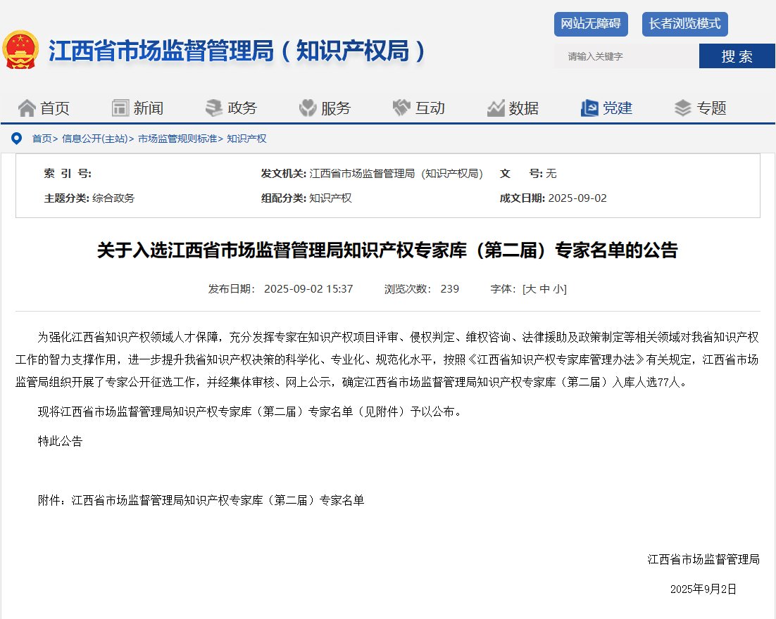 2025年9月2日,江西省市场监督管理局发布了《关于入选江西省市场监督管理局知识产权专家库(第二届)专家名单的公告》,北京超成律师事务所罗艳、刘维两位律师受聘为“江西省市场监督管理局知识产权专家库(第二届)专家”。