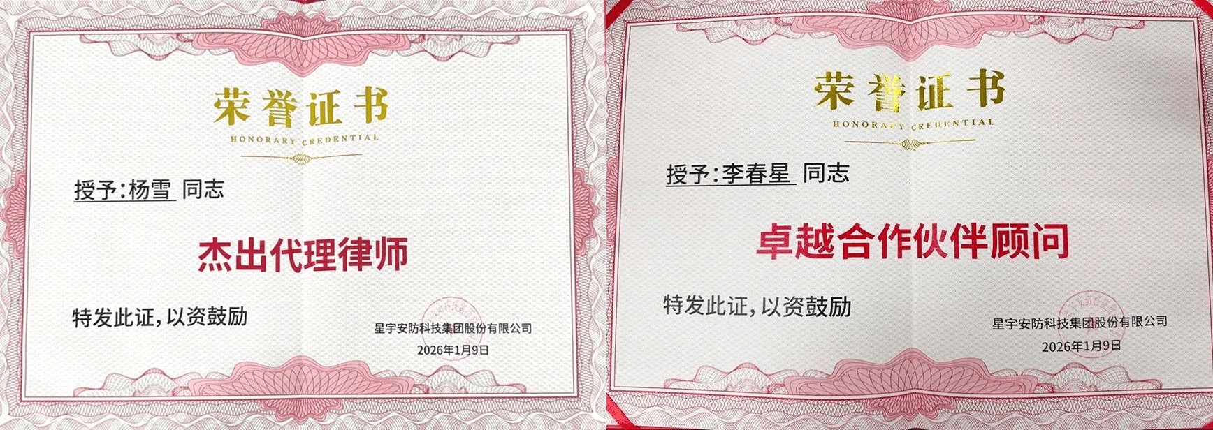 近日,星宇安防科技集团股份有限公司(以下简称“星宇安防”)向超凡知识产权服务股份有限公司(以下简称“超凡”)及北京超成律师事务所(以下简称“超成律所”)的专业服务团队发来表彰,分别授予资深律师杨雪、知识产权规划师李春星“杰出代理律师” “卓越合作伙伴顾问” 荣誉称号。